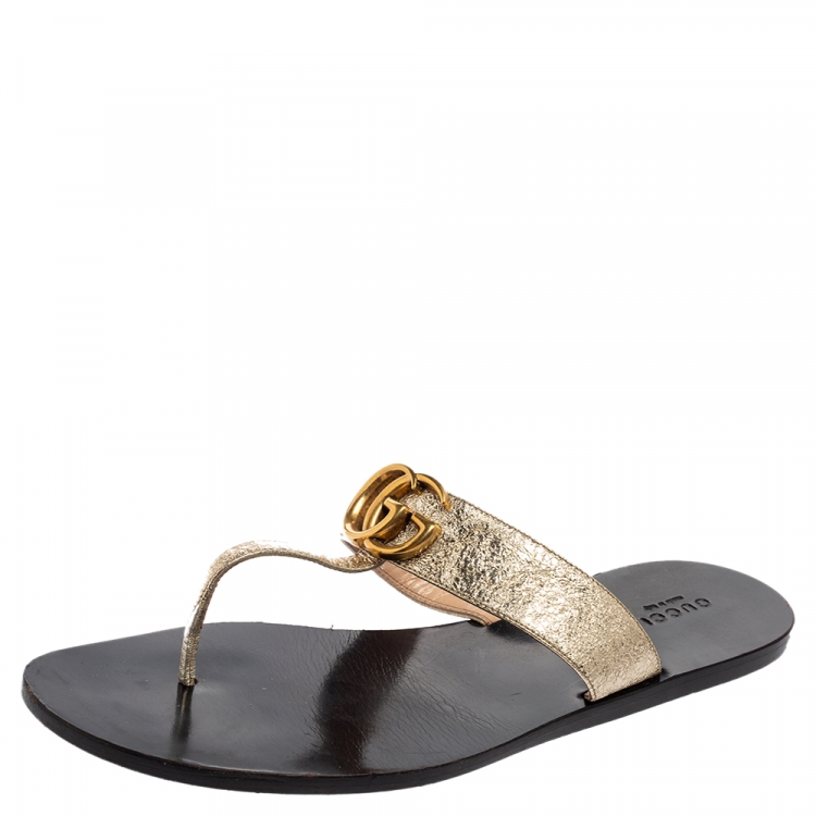 صندل فلات إصبع غوتشي جي جي مارمونت جلد مجعد ذهبي مقاس 40