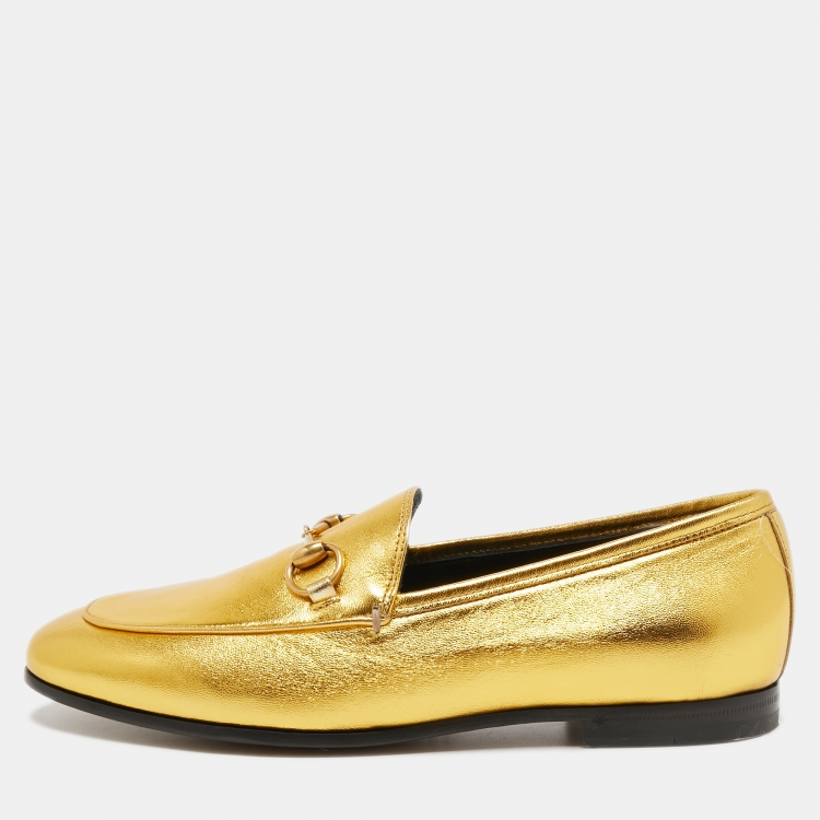 Gucci Gold Leather Hosrsebit Jordaan Loafers Size 35