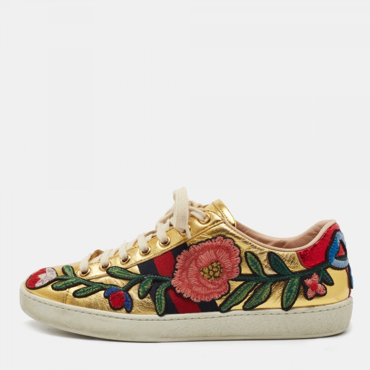 Gucci Gold Python Embossed Leather and Leather Floral Embroidered Ace Low Top Sneakers Size 37
