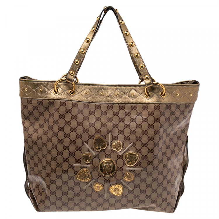 حقيبة يد غوتشي ارينا مرصعة جلد وكانفاس مقوى كريستال جي جي بيج/ذهبية