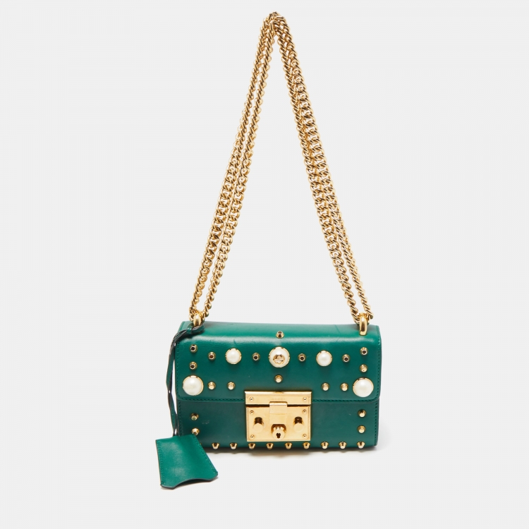 Gucci Green Leather Small Pearl Studded Padlock Shoulder Bag