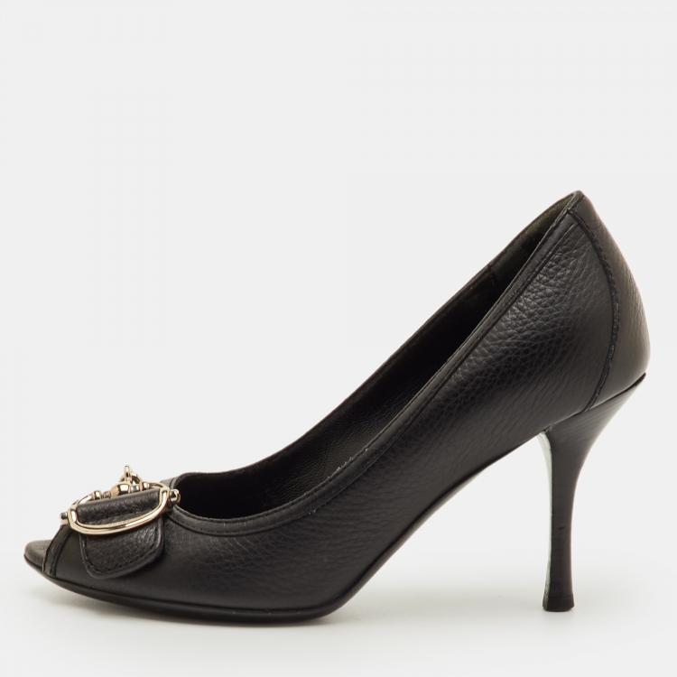 Pre Owned حذاء كعب عالي غوتشي مزين هورسبيت جلد أسود مقدمة مفتوحة مقاس 35.5