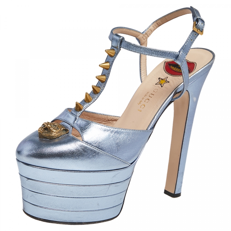 Pre Owned صندل غوتشي جلد أزرق ميتاليك سير حرف تي نعل سميك مقاس 38
