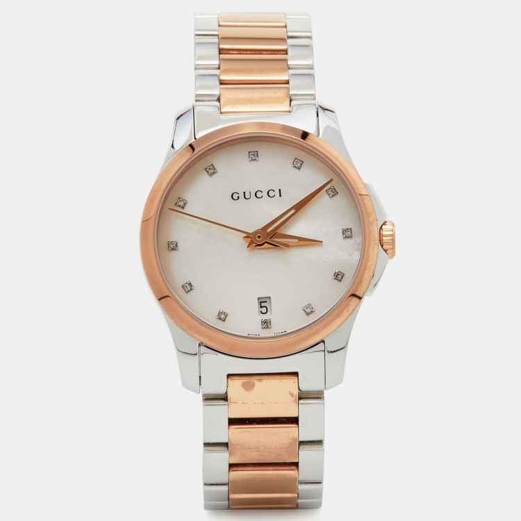 Pre Owned ساعة يد نسائية غوتشي YA126544 ألماس وستانلس ستيل لونين وصدف 27 مم