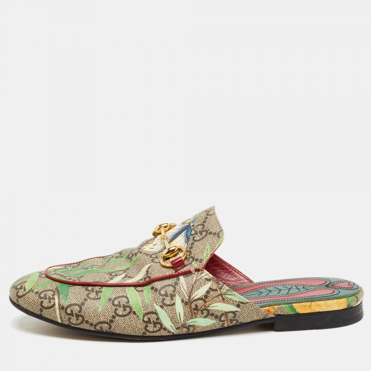 Gucci Multicolor Tian Print GG Supreme Canvas Horsebit Flat Mules Size 36