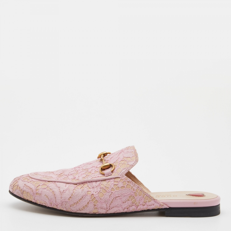Pre Owned صندل فلات مول غوتشى برنستاون جلد ودانتيل زهور وردى /بيج مقاس 38