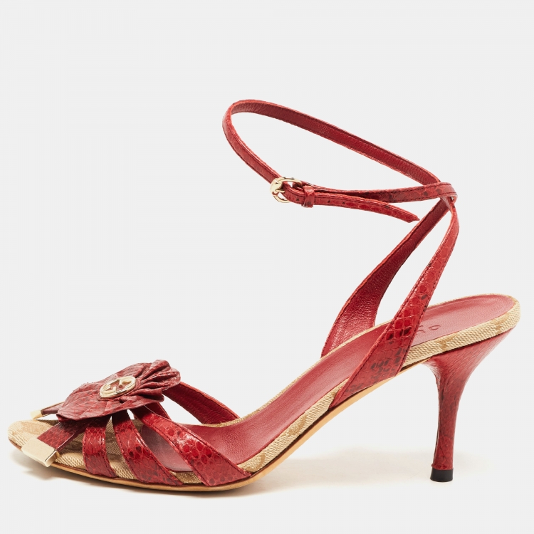 صندل غوتشي جلد ثعبان أحمر بحزام كاحل ملتف مقاس 36