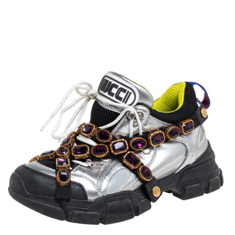 Gucci Silver/Black Leather And Mesh Flashtrek Removable Crystal Sneakers Size 39
