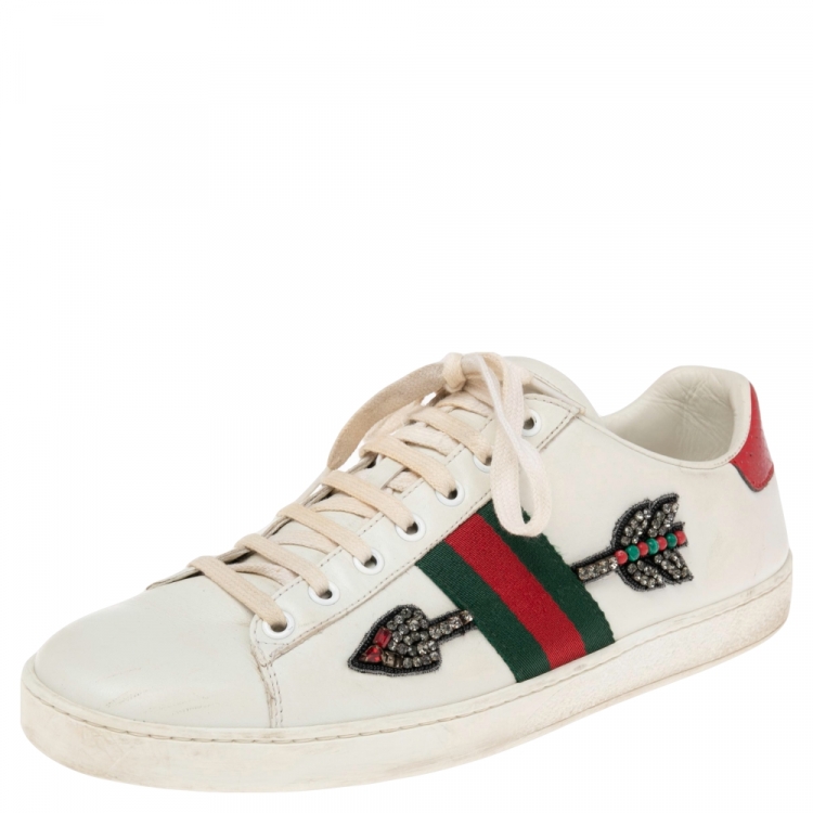 حذاء رياضي غوتشي جلد أبيض مزخرف كريستال عنق منخفض مقاس 40.5