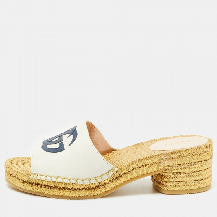 مملوكة مسبقًا Gucci White Leather GG Espadrille Block Heel Slide Sandals Size 36.5