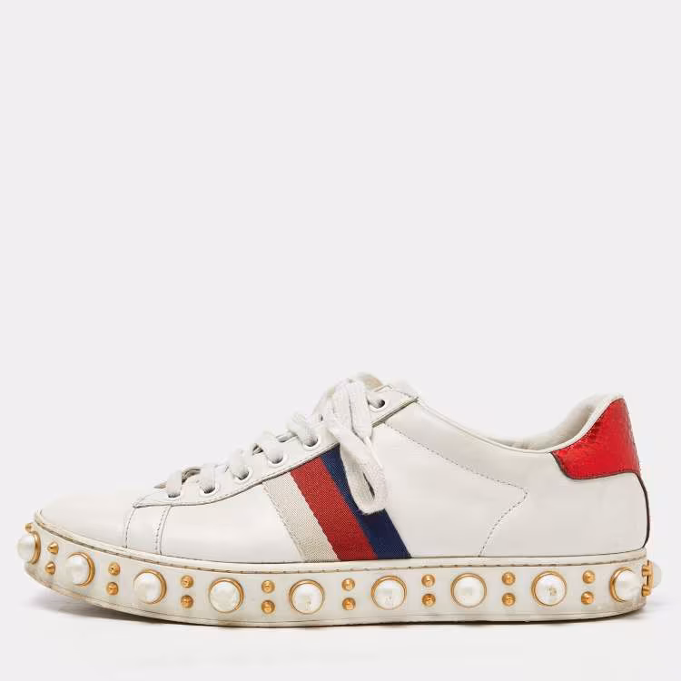 حذاء رياضي غوتشي مرتفع من أعلى مزخرف لؤلؤ صناعي نيو أيس تفاصيل ويب حواف جلد ثعبان جلد أبيض مقاس 36.5