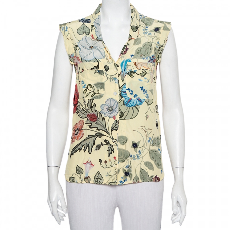 قميص غوتشي بلا أكمام أزرار أمامية حرير طباعة زهور أصفر مقاس متوسط