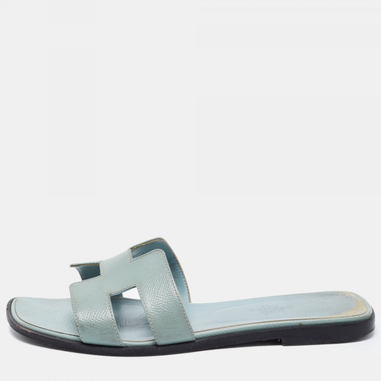 Hermes Blue Leather Oran Flat Slides Size 38.5