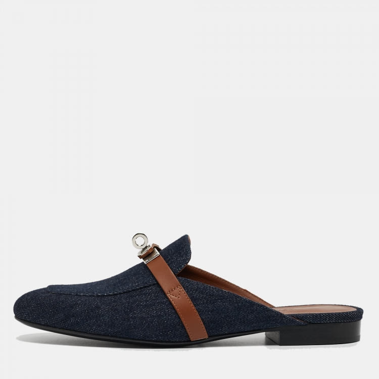 مملوكة مسبقًا حذاء سلايد فلات هيرمس أوز جلد ودنيم أزرق كحلي/بني فاتح مقاس 37