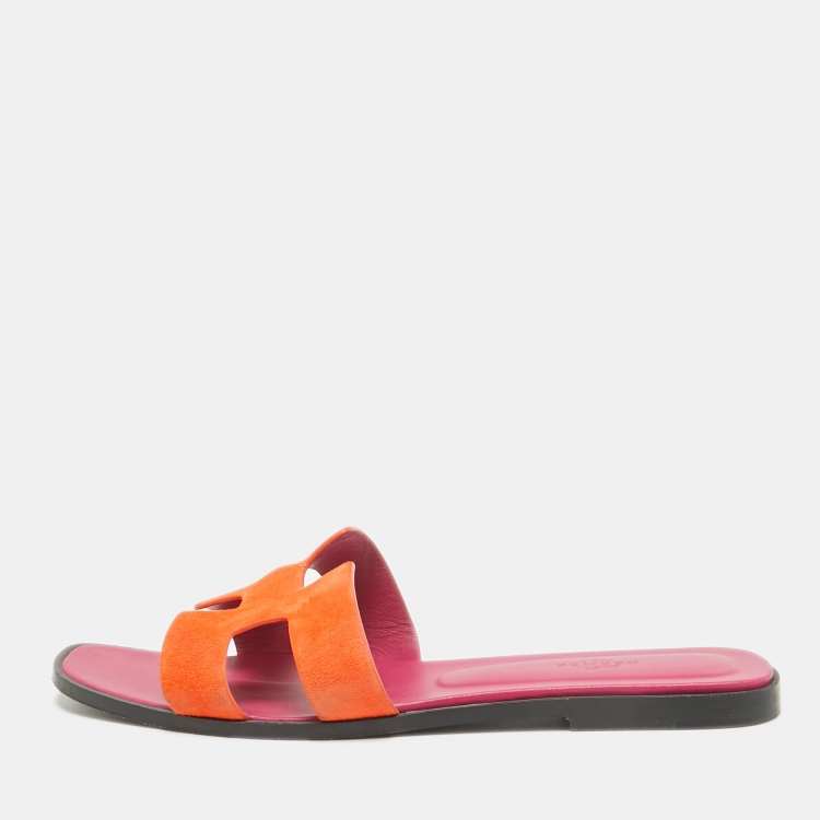 Pre Owned Hermes Orange Suede Oran Flat Slides Size 41.5