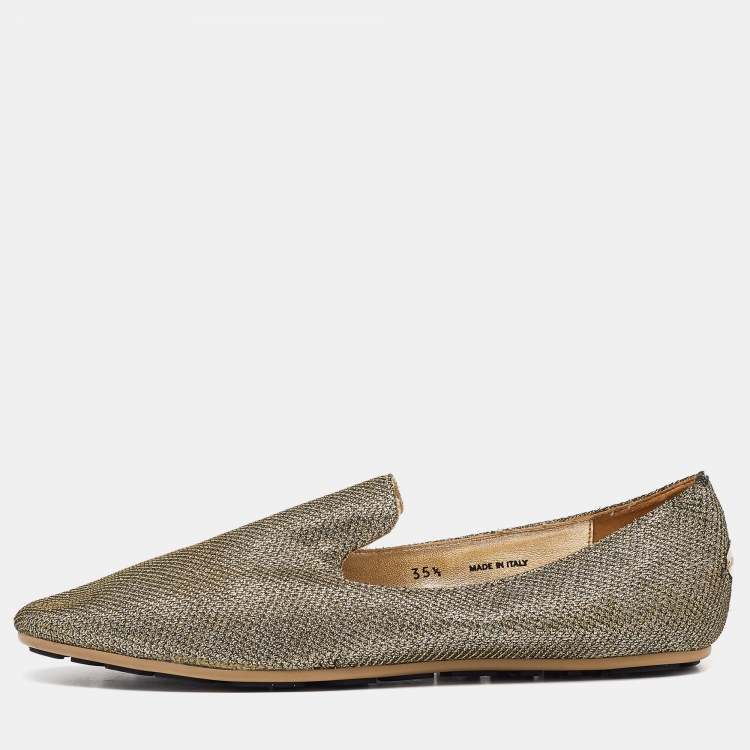 Jimmy Choo Gold Glitter Lame Fabric Slip On Smoking Slippers Size 35.5