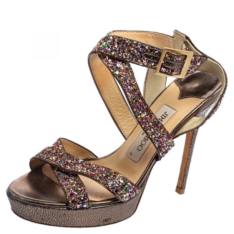 مملوكة مسبقًا صندل جيمي تشو جلد غليتر خشن متعدد الألوان نعل سميك مقاس 37