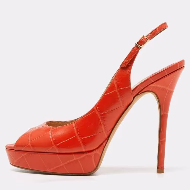 مملوكة مسبقًا حذاء كعب عالي جيمي تشو جلد برتقالي مضغوط بكعب مفتوح من الأمام وأربطة من الخلف مقاس 39