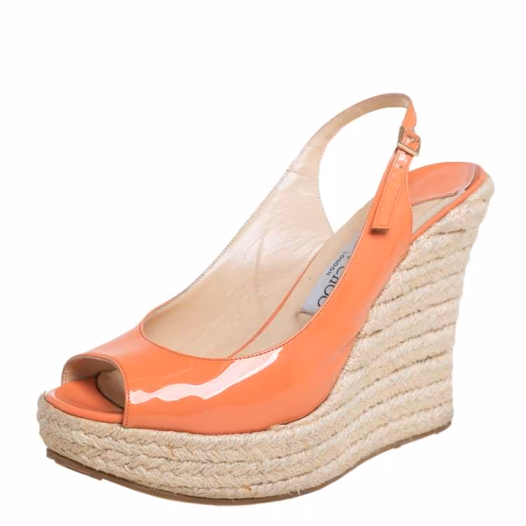 صندل جيمي تشو جلد برتقالي لامع إسبادريل كعب روكي بحزام للكاحل مقاس 38.5