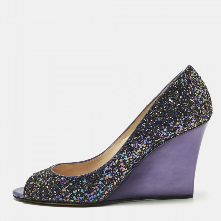 مملوكة مسبقًا حذاء كعب عالي جيمي تشو قماش غليتر بنفسجي بيكسان مقدمة مفتوحة كعب روكي مقاس 40