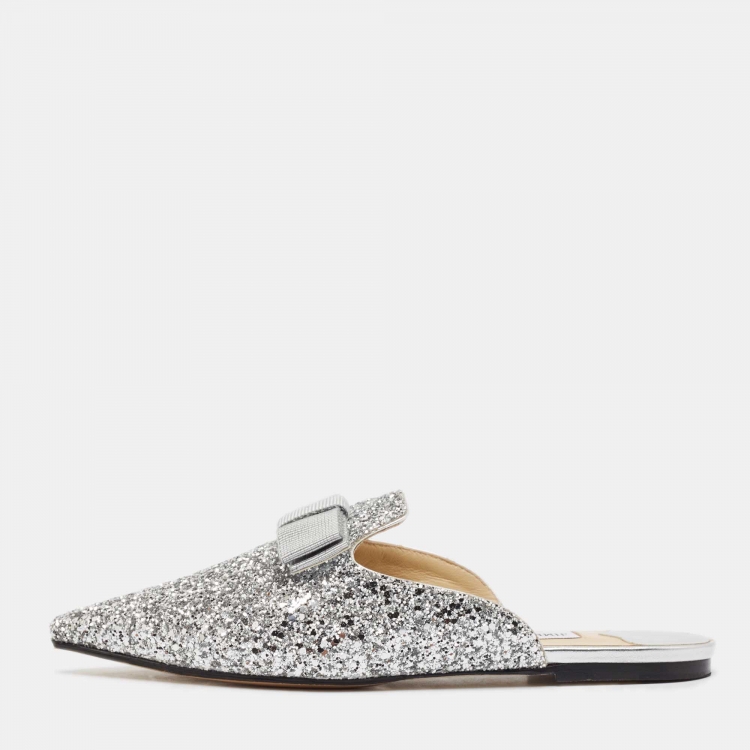 صندل جيمي تشو فلات بفصوص لامعة فضية مع فيونكة مقاس 38.5