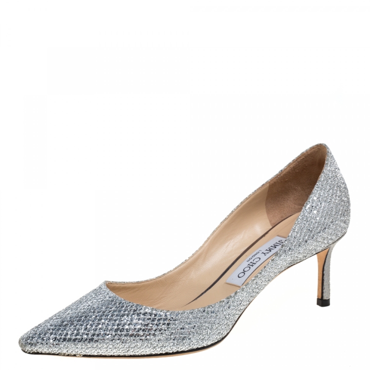 حذاء كعب عالي جيمي تشو رومي غليتر فضي مقاس 38