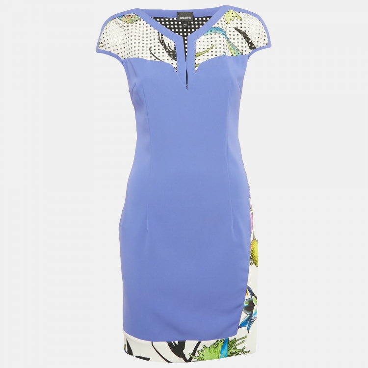 Pre Owned فستان جست كافالي قصير بنقشة زهور أرجوانية من القماش المشغول مع تفاصيل مفرغة مقاس صغير