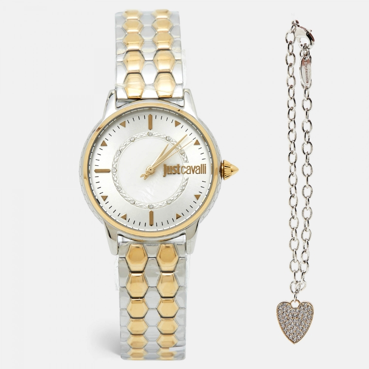 Pre Owned Just Cavalli Silver Mother of Pearl Two-Tone Stainless Steel Valentines JC1L149M0075 Women's Wristwatch and Bracelet Set 35 mm