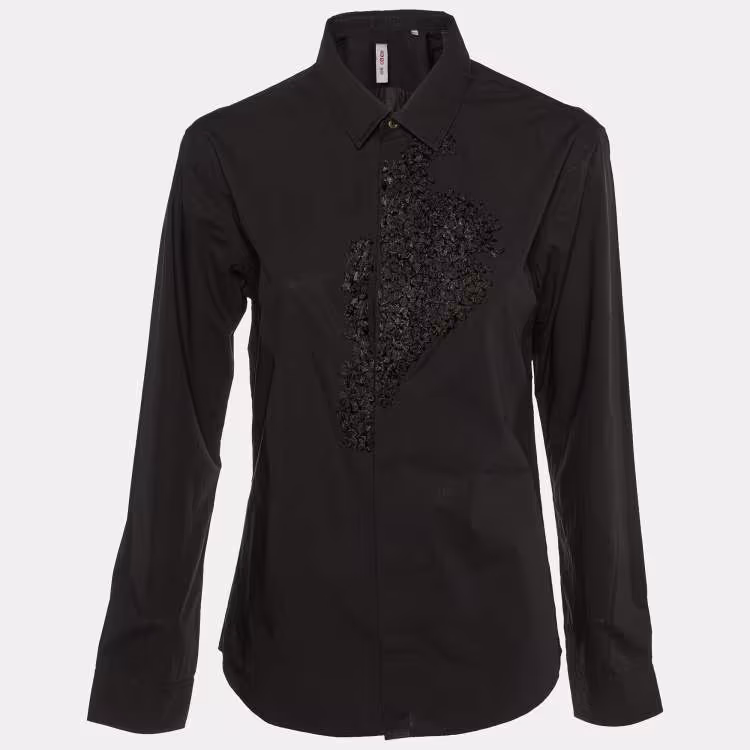 مملوكة مسبقًا قميص كنزو ديفيله أسود قطن بتفصيل شريط وأزرار مقاس كبير