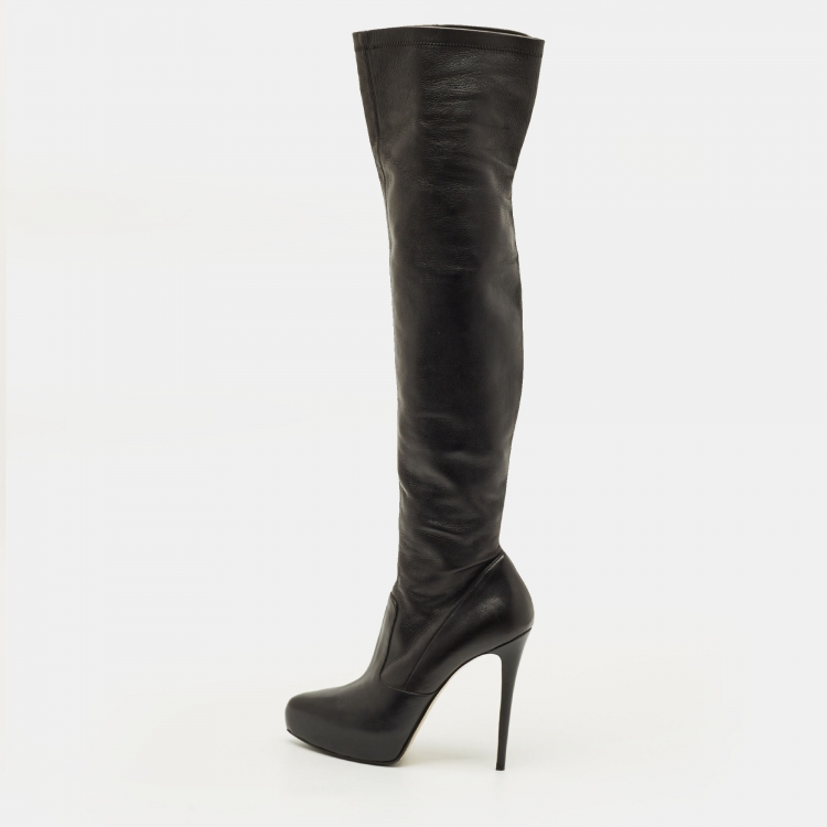 بوت فوق الركبة لي سيلا جلد أسود نعل سميك مقاس 37.5