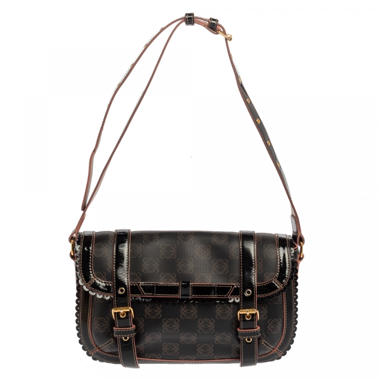 حقيبة كتف لويفي جلد لامع وبلاستيك مشمع اناغرام وردي وبني داكن