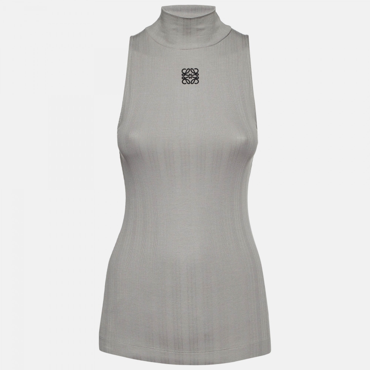 Pre Owned Loewe Grey Embroidered Cotton Knit High Neck Tank Top M