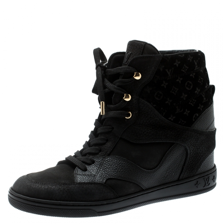 مملوكة مسبقًا حذاء رياضي لوي فيتون عنق مرتفع جلد وسويدي مونوغرامي بيج فاتح مقاس 37