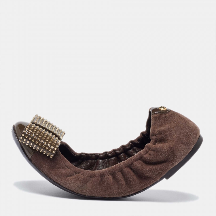 Louis Vuitton Brown/Green Suede and Patent Leather Mimi Studded Bow Scrunch Ballet Flats Size 38.5