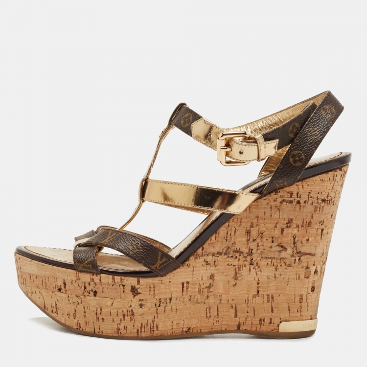 Louis Vuitton Gold/Brown Leather and Monogram Canvas Cork Wedge Strappy Sandals Size 38.5
