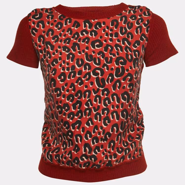 Pre Owned بلوزة لوي فيتون حرير وصوف بطبعة النمر الأحمر بأكمام قصيرة مقاس كبير
