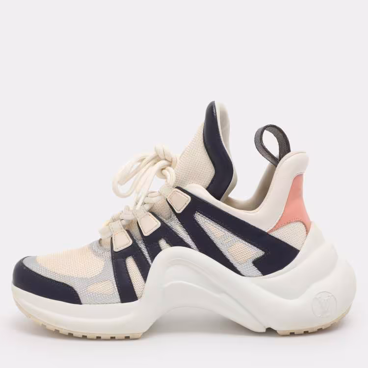 مملوكة مسبقًا حذاء رياضي لوي فيتون آرتش لايت شبكة ومونوغرام كانفس أبيض/أزرق كحلي مقاس 39
