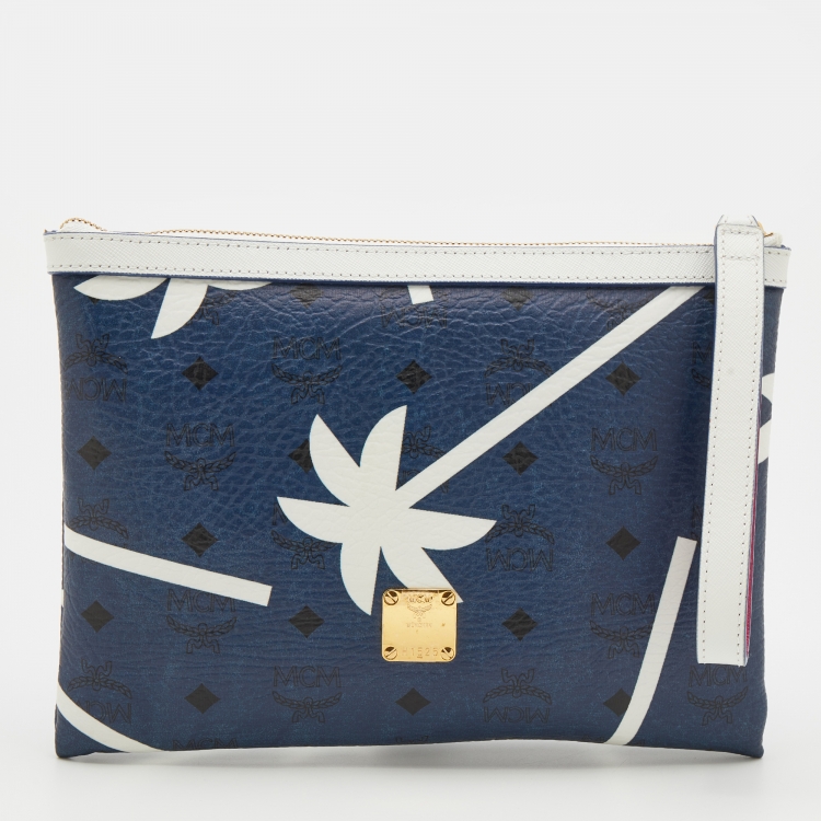 MCM Blue/White Printed Coated Canvas Zip Wristlet Clutch