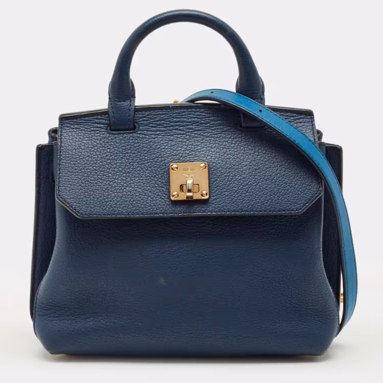 Pre Owned حقيبة يد علوية إم سي إم من جلد بلونين أزرق مع غطاء ميلا فلاب