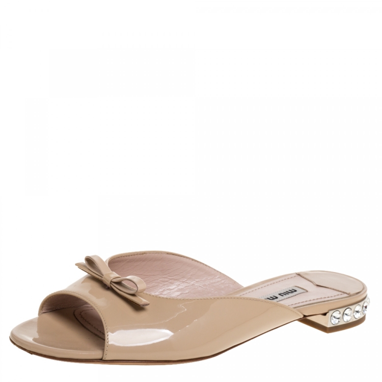 مملوكة مسبقًا حذاء ميو ميو فلات مقدمة مفتوحة فيونكة كعب مزخرف كريستال جلد لامع بيج مقاس 36.5