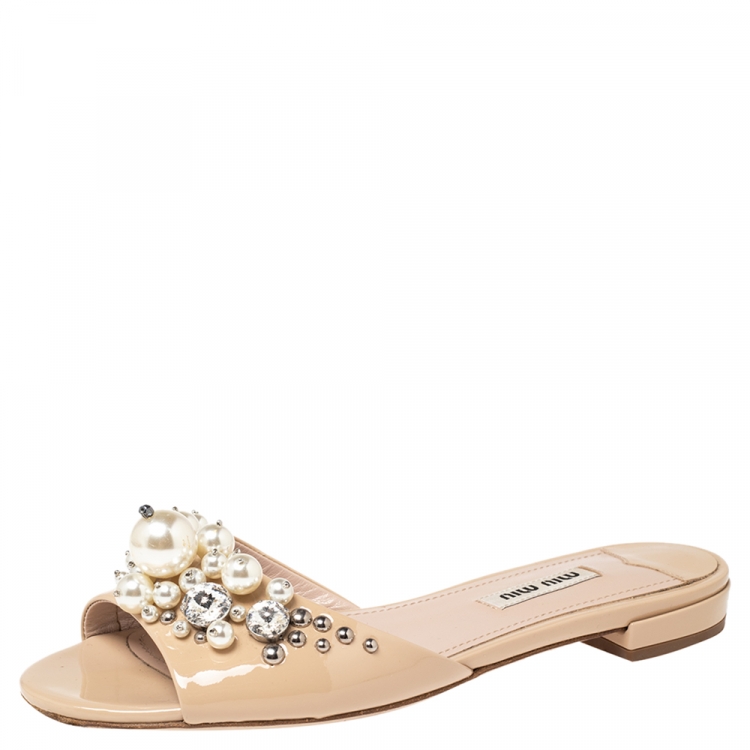 Pre Owned صندل سلايد فلات ميو ميو بيج لامع لؤلؤ مزخرف مقاس 35.5