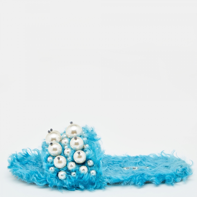 حذاء سلايدز ميو ميو فلات فرو صناعي أزرق مزخرف لؤلؤ مقاس 38.5