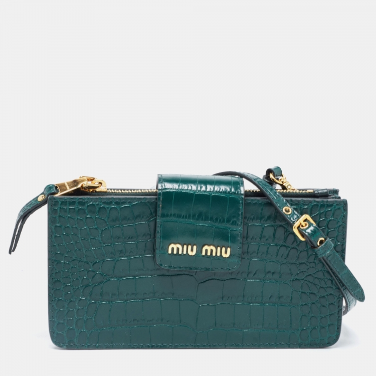 Miu Miu Green Croc Embossed Leather Phone Wallet Crossbody Bag