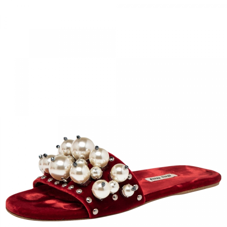 صندل فلات ميو ميو مزخرف لؤلؤ صناعى قطيفة أحمر مقاس 37.5