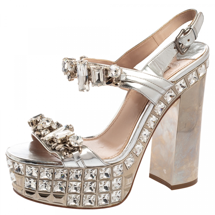 Pre Owned صندل ميو ميو جلد فضي مزخرف كريستال كعب سميك نعل سميك مقاس 38
