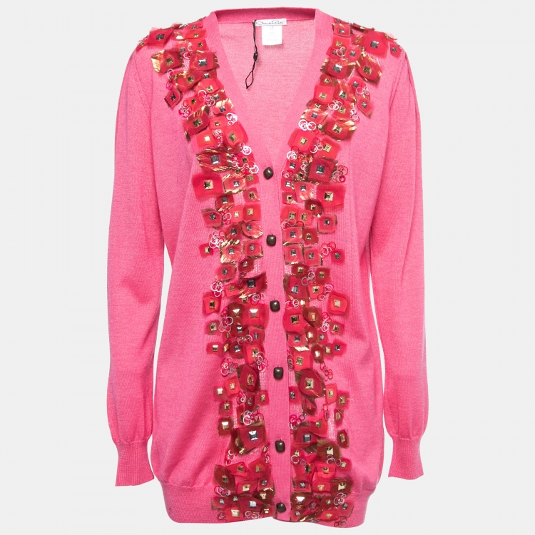 مملوكة مسبقًا Oscar de la Renta Pink Embellished Cashmere and Silk Knit Button Front Cardigan M