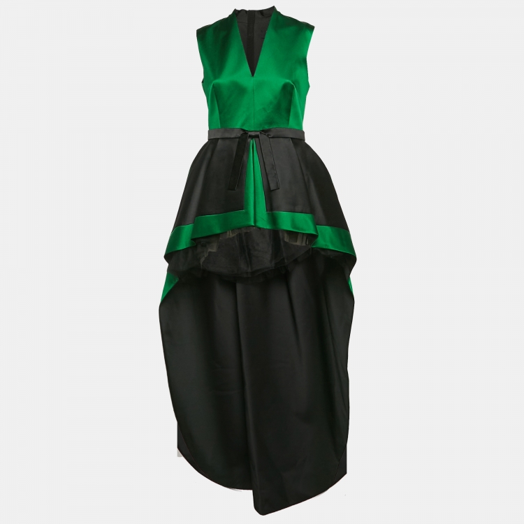 Pre Owned Paule Ka Green/Black Silk Asymmetric V-Neck Gown S