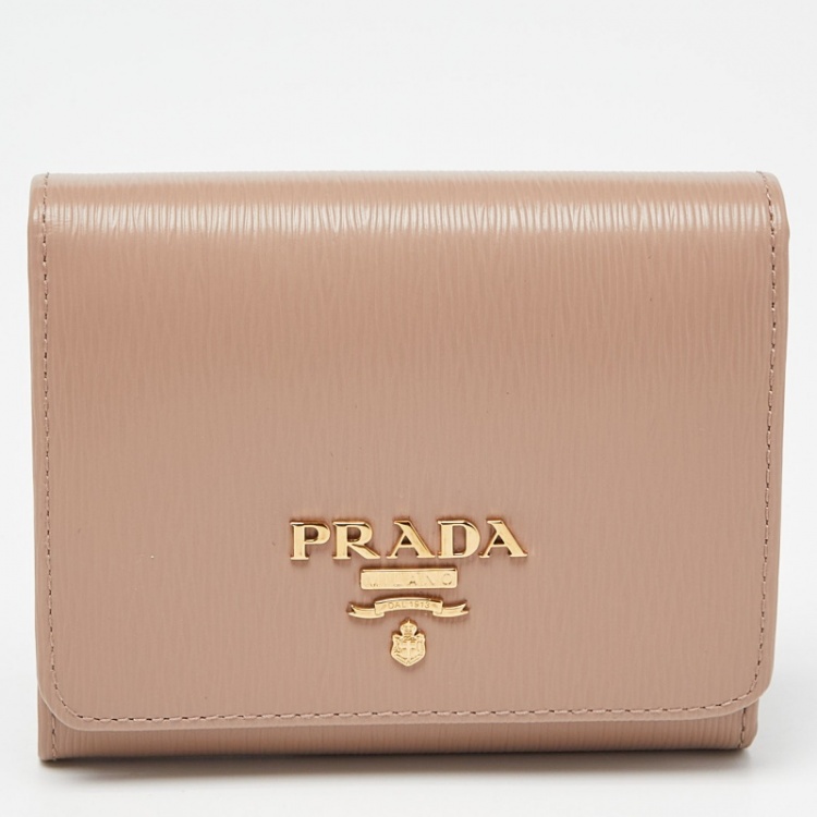 Prada Beige Vitello Metal Leather Logo Trifold Wallet
