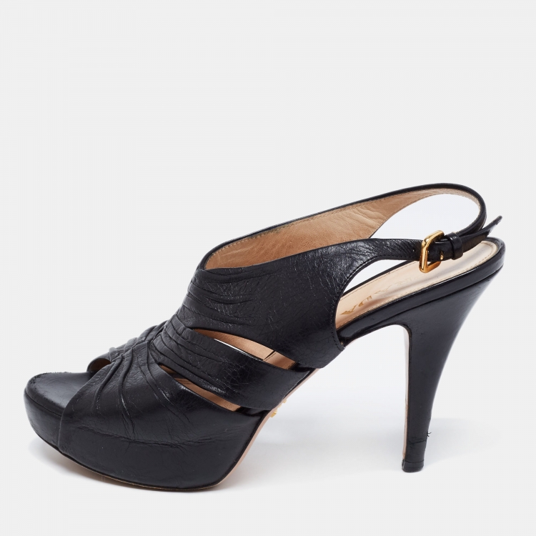 مملوكة مسبقًا صندل برادا جلد أسود بسيور مقدمة مفتوحة فتحة كعب نعل سميك مقاس 37.5