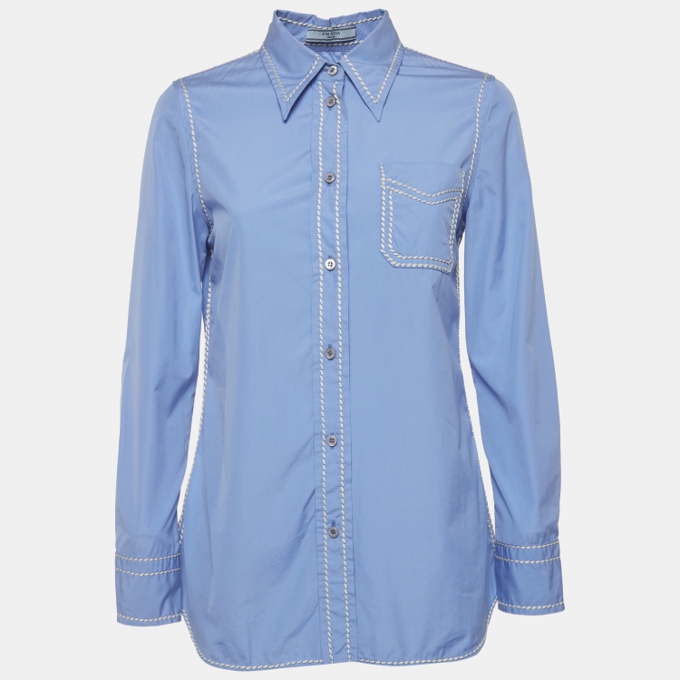 Pre Owned قميص برادا قطن أزرق تطريز متباين بأكمام طويلة مقاس متوسط - ميديام